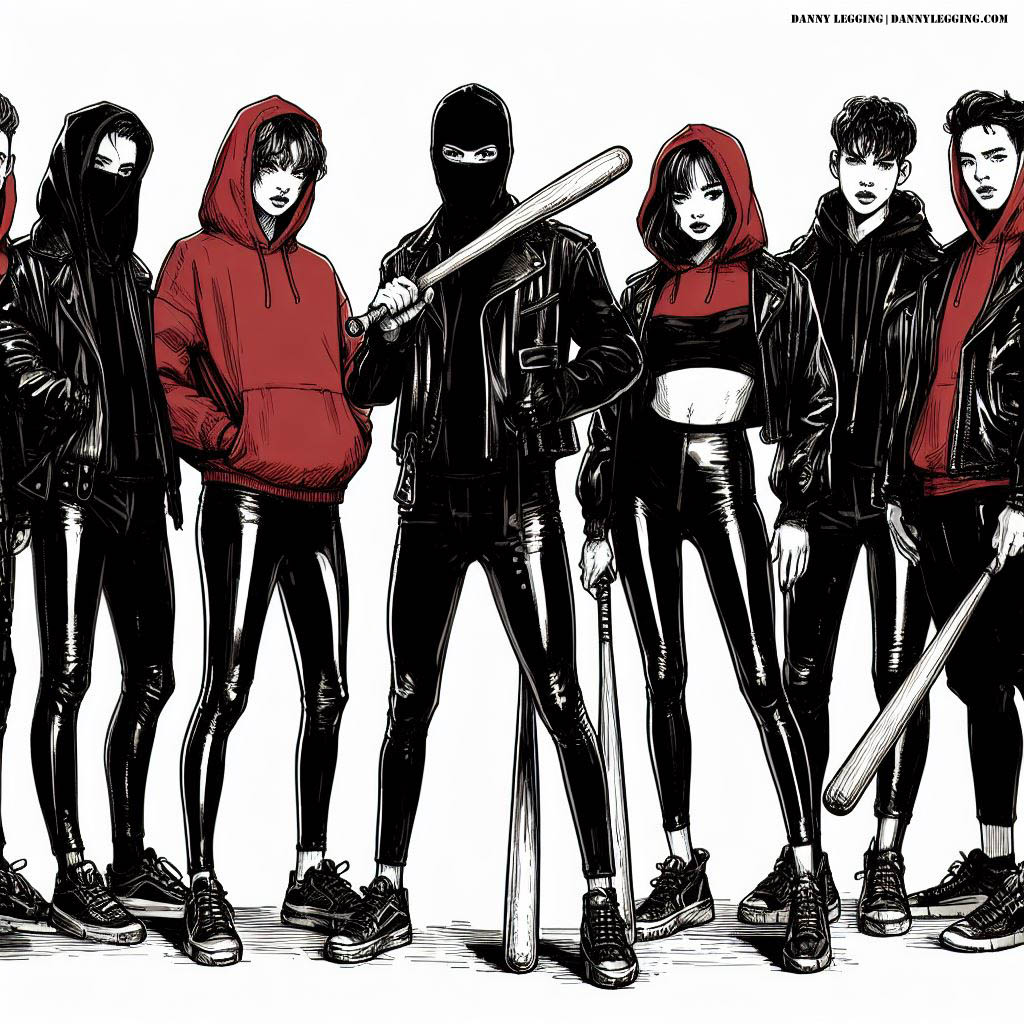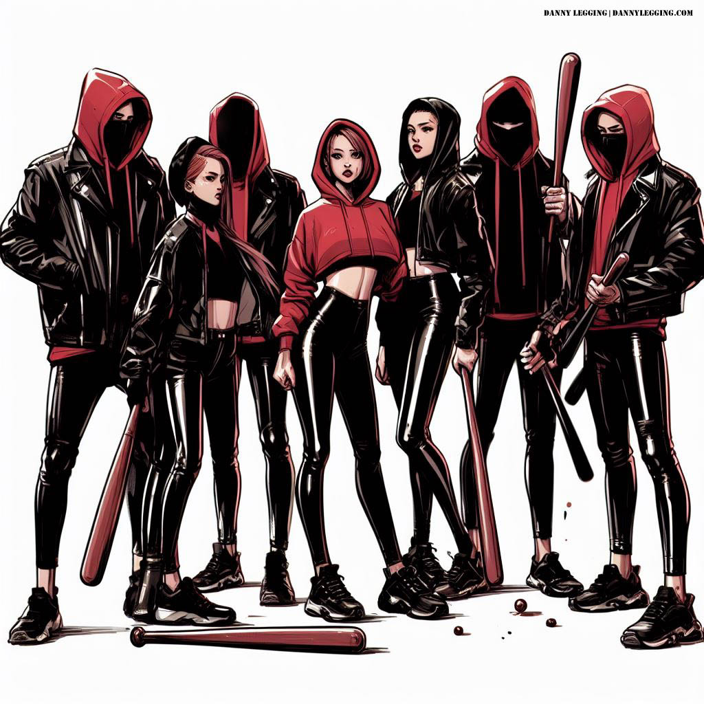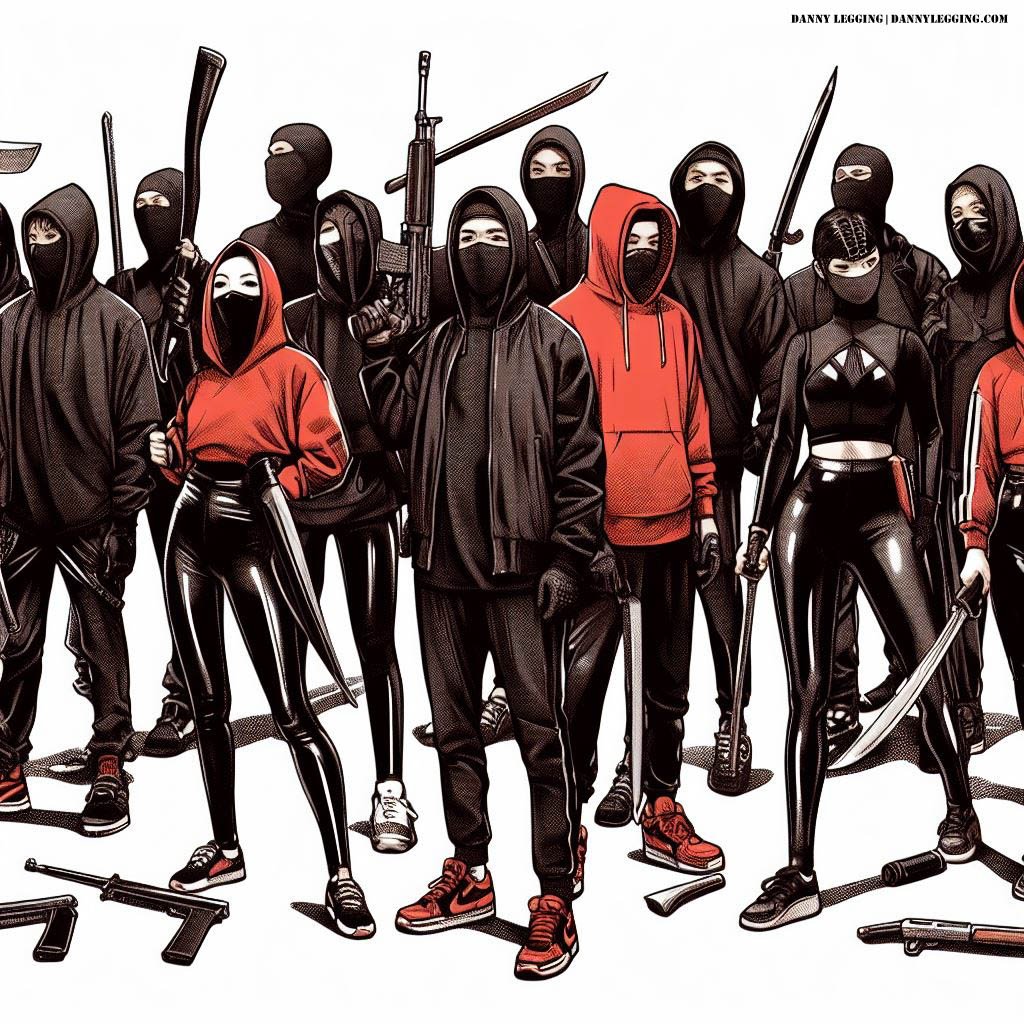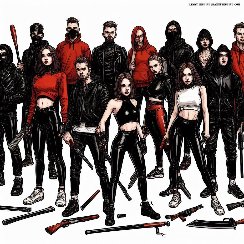 AI generated art depicting groups of people in red and black with melee and other weapons, wearing hoodies, masks, leather leggings and pants. Modernised looking street gang you’d see in a video game.