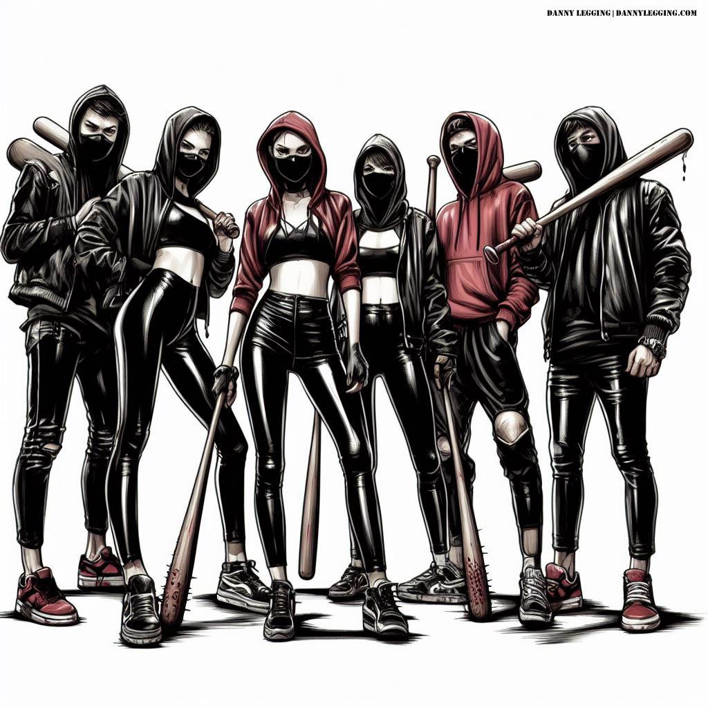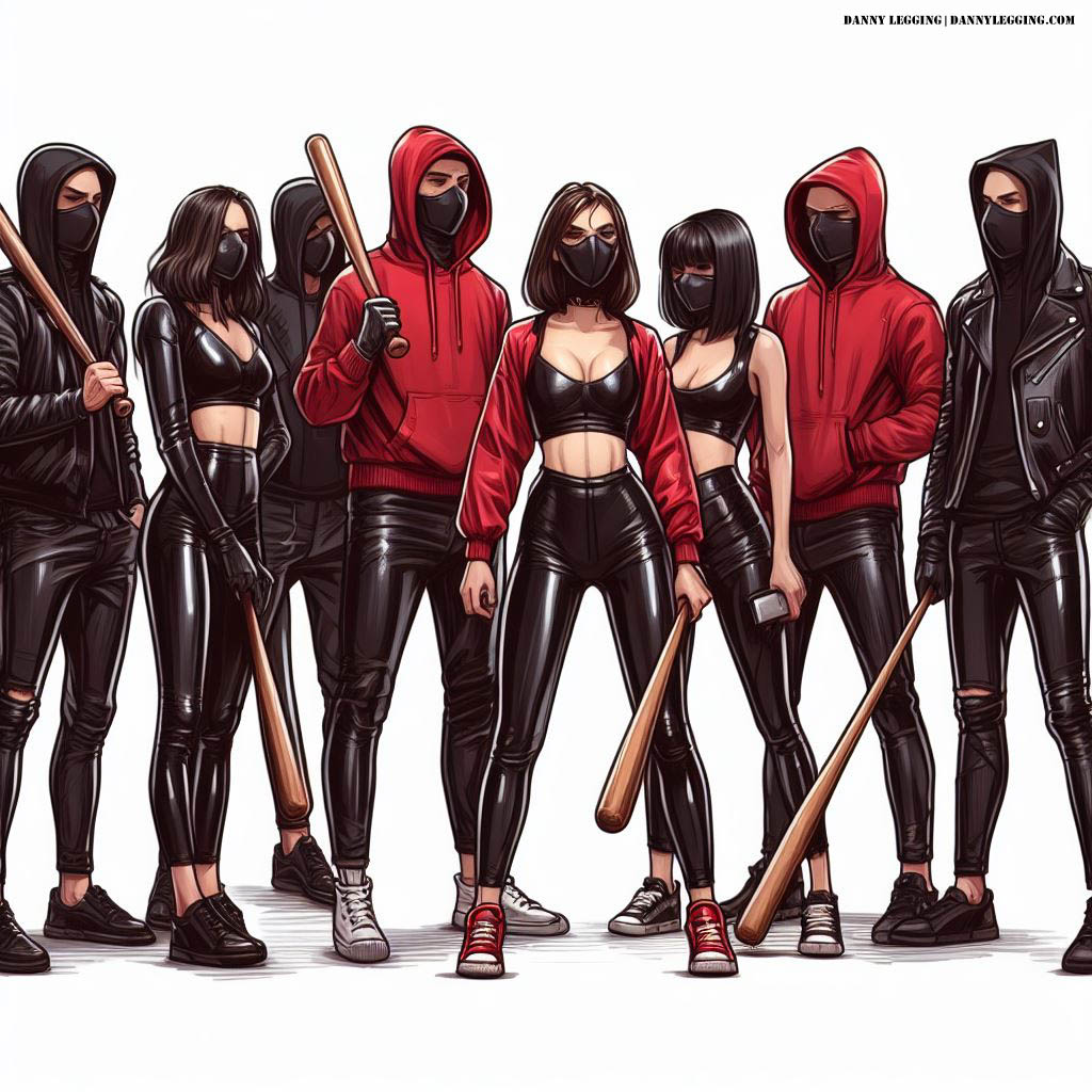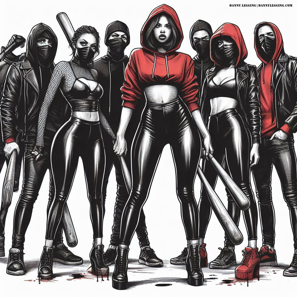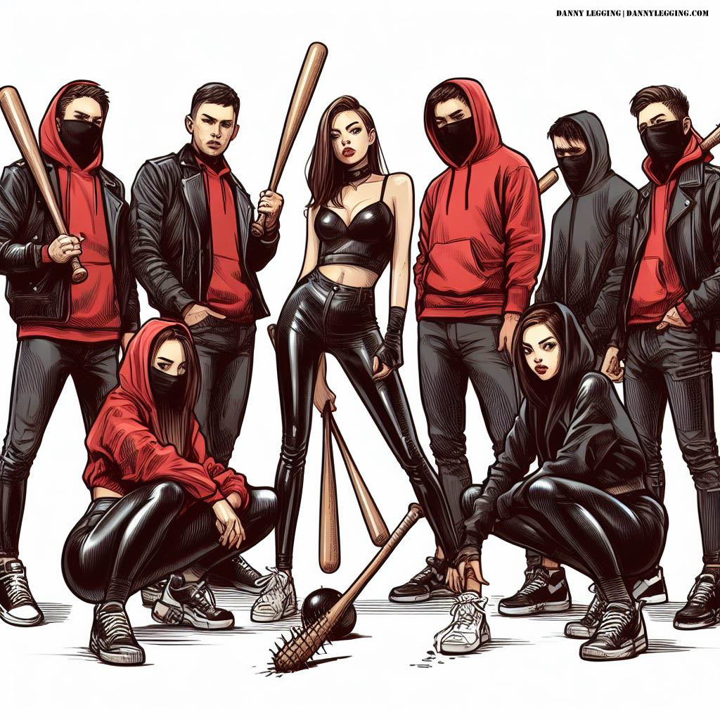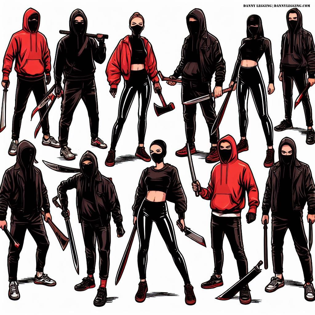 AI generated art depicting groups of people in red and black with melee and other weapons, wearing hoodies, masks, leather leggings and pants. Modernised looking street gang you’d see in a video game.