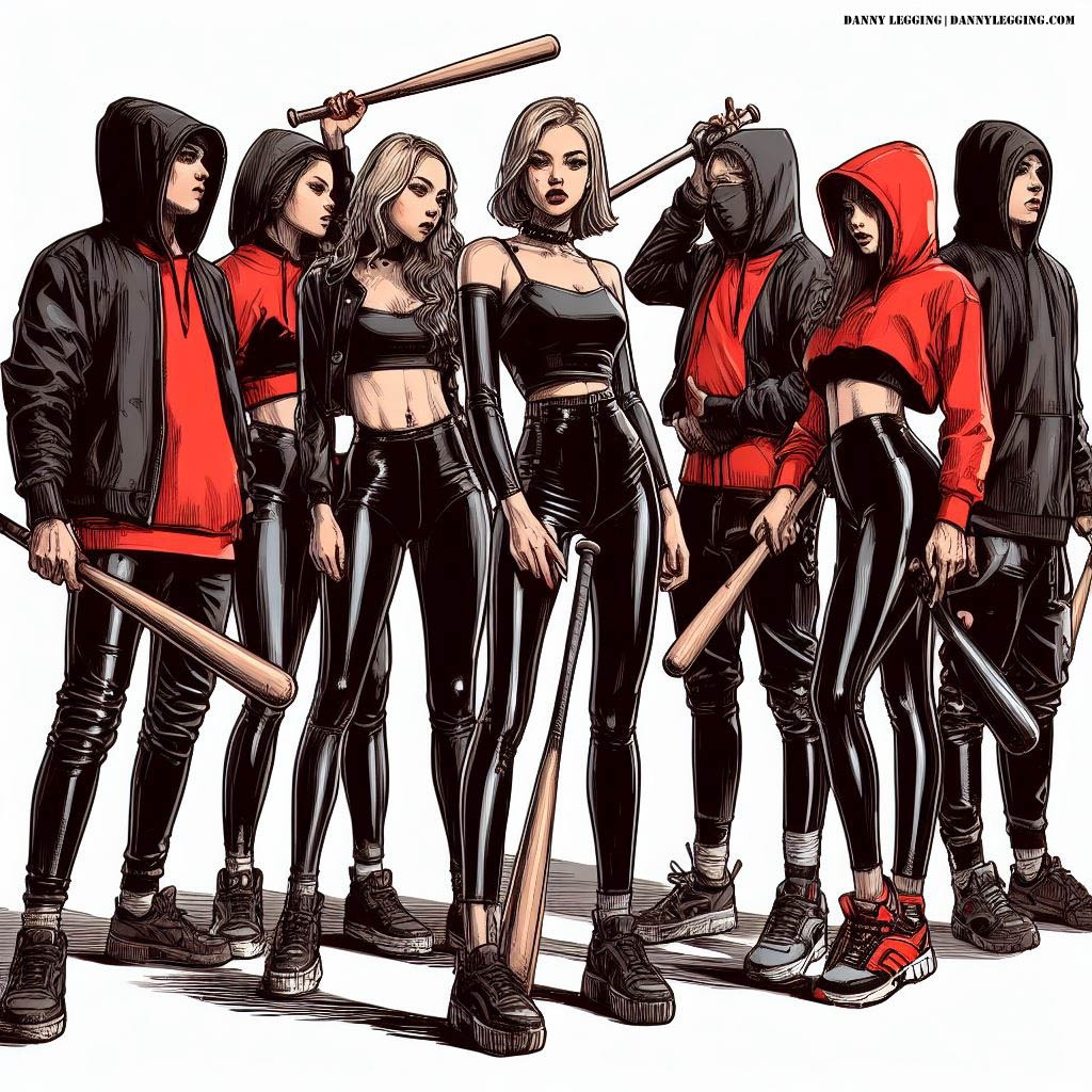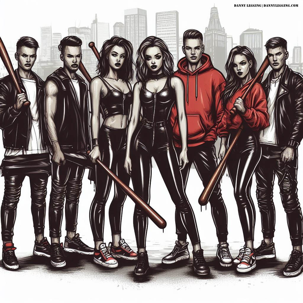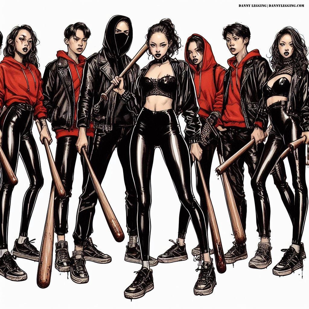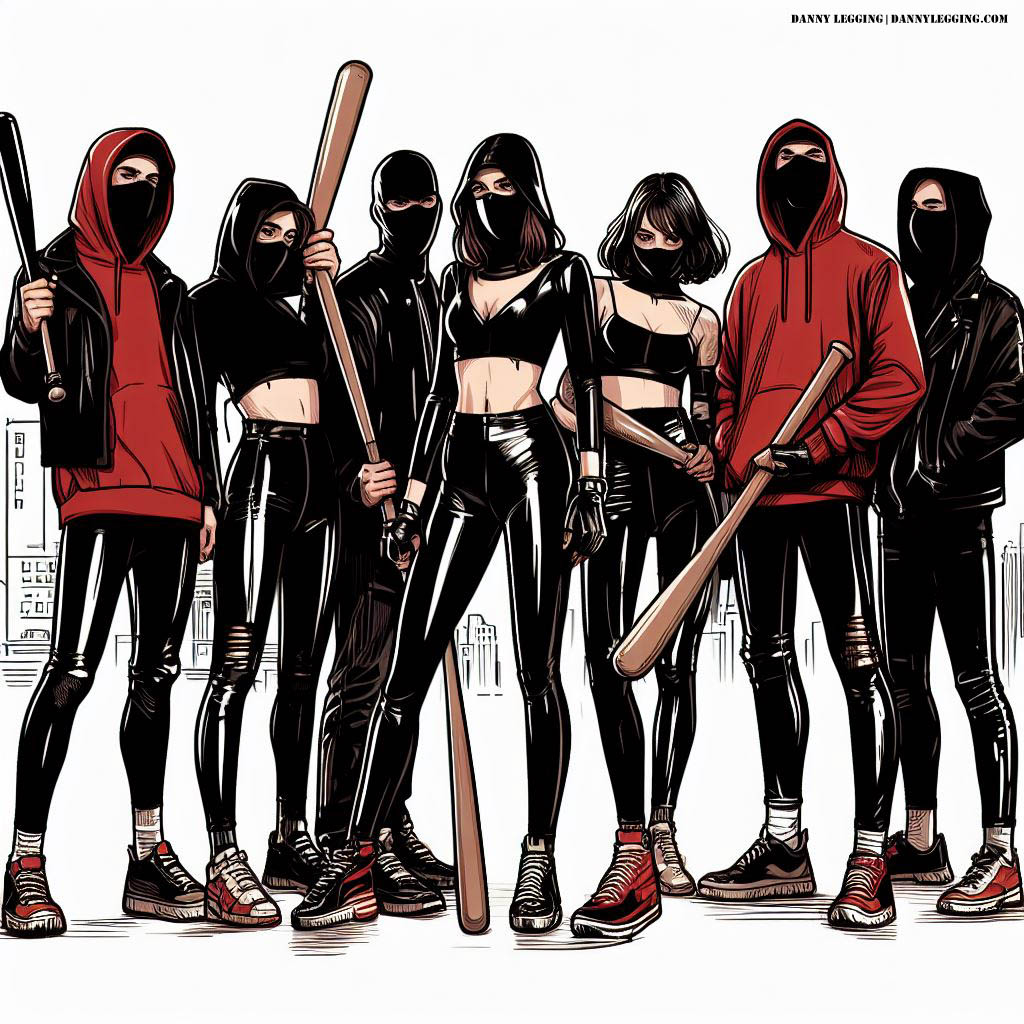 AI generated art depicting groups of people in red and black with melee and other weapons, wearing hoodies, masks, leather leggings and pants. Modernised looking street gang you’d see in a video game.