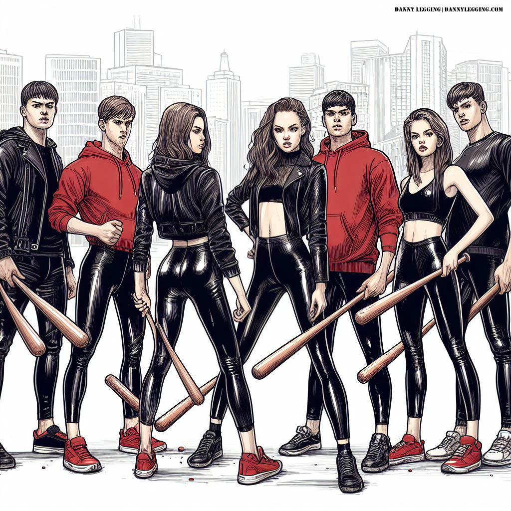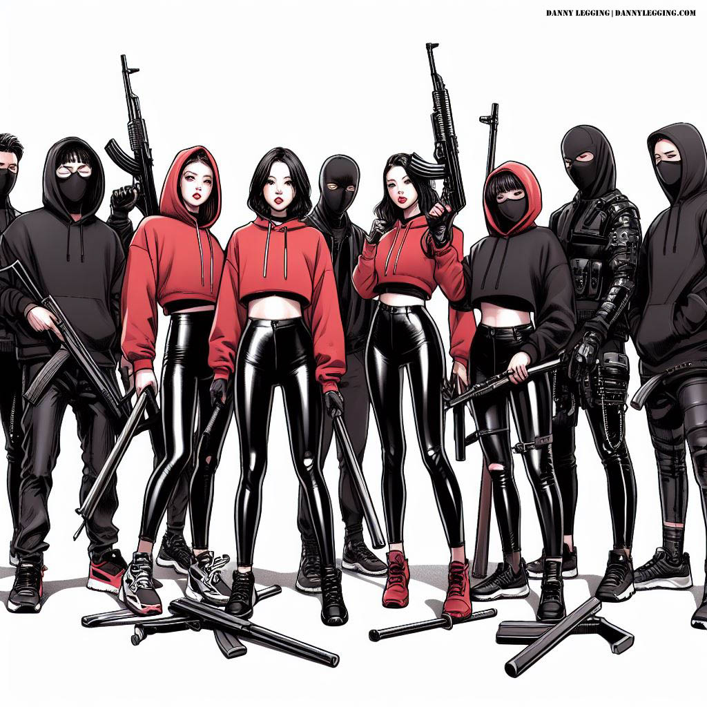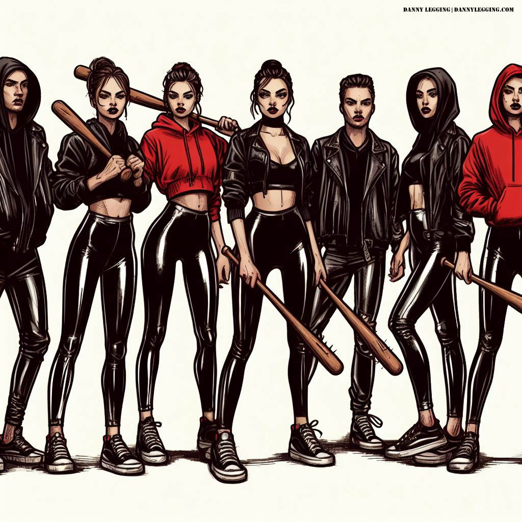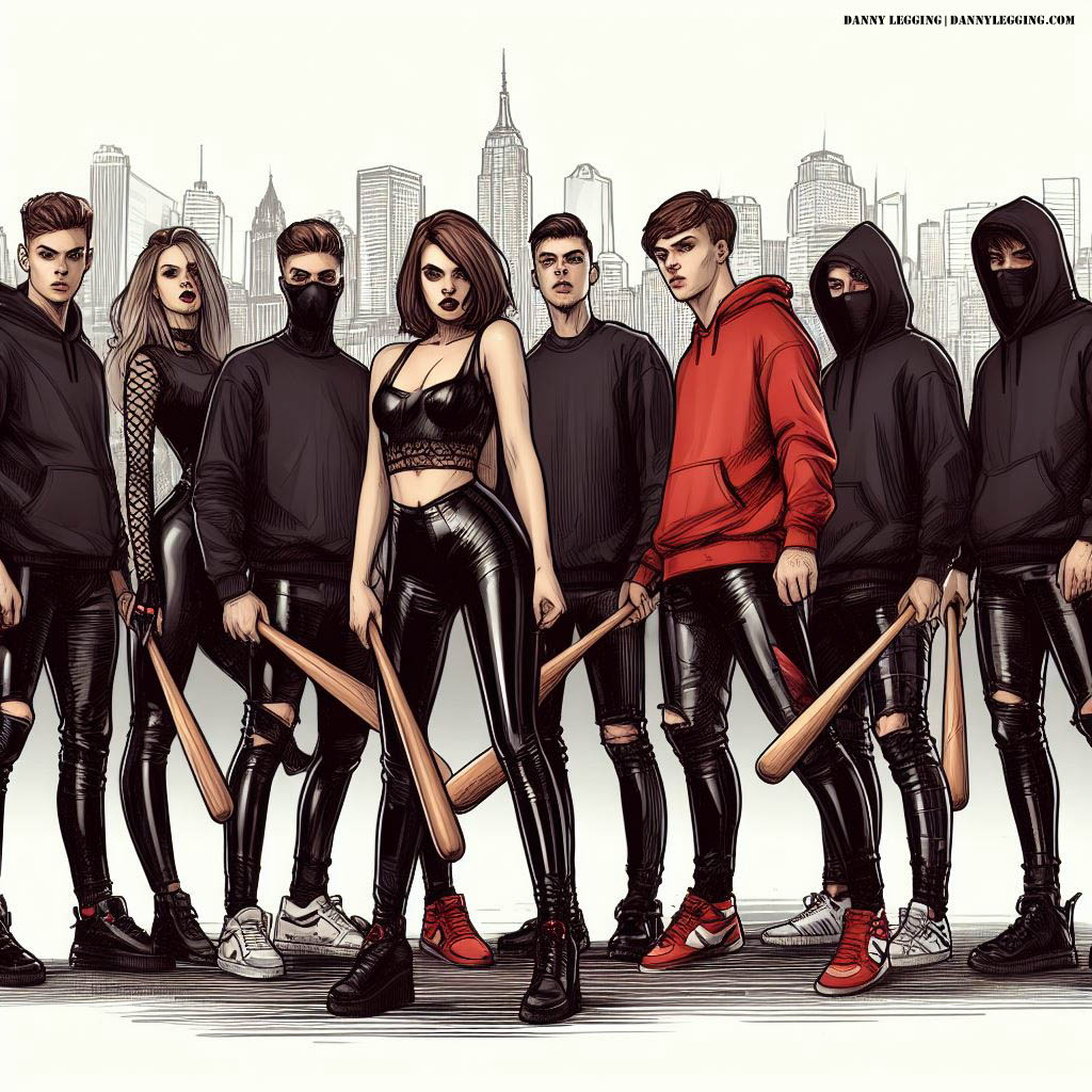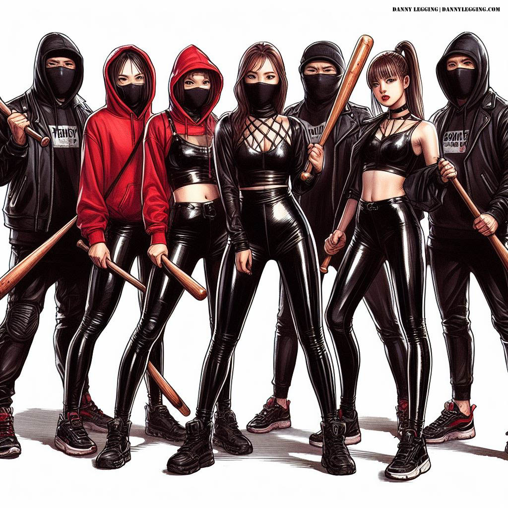 AI generated art depicting groups of people in red and black with melee and other weapons, wearing hoodies, masks, leather leggings and pants. Modernised looking street gang you’d see in a video game.