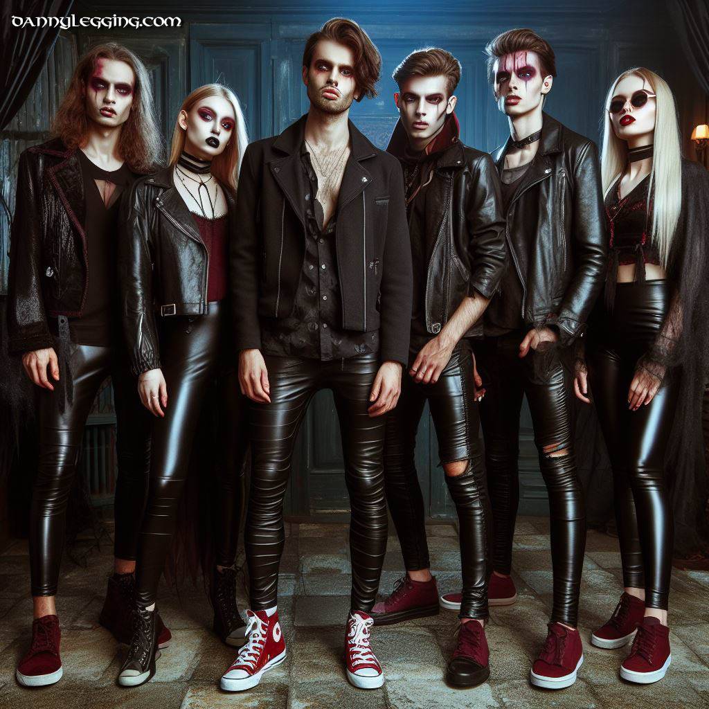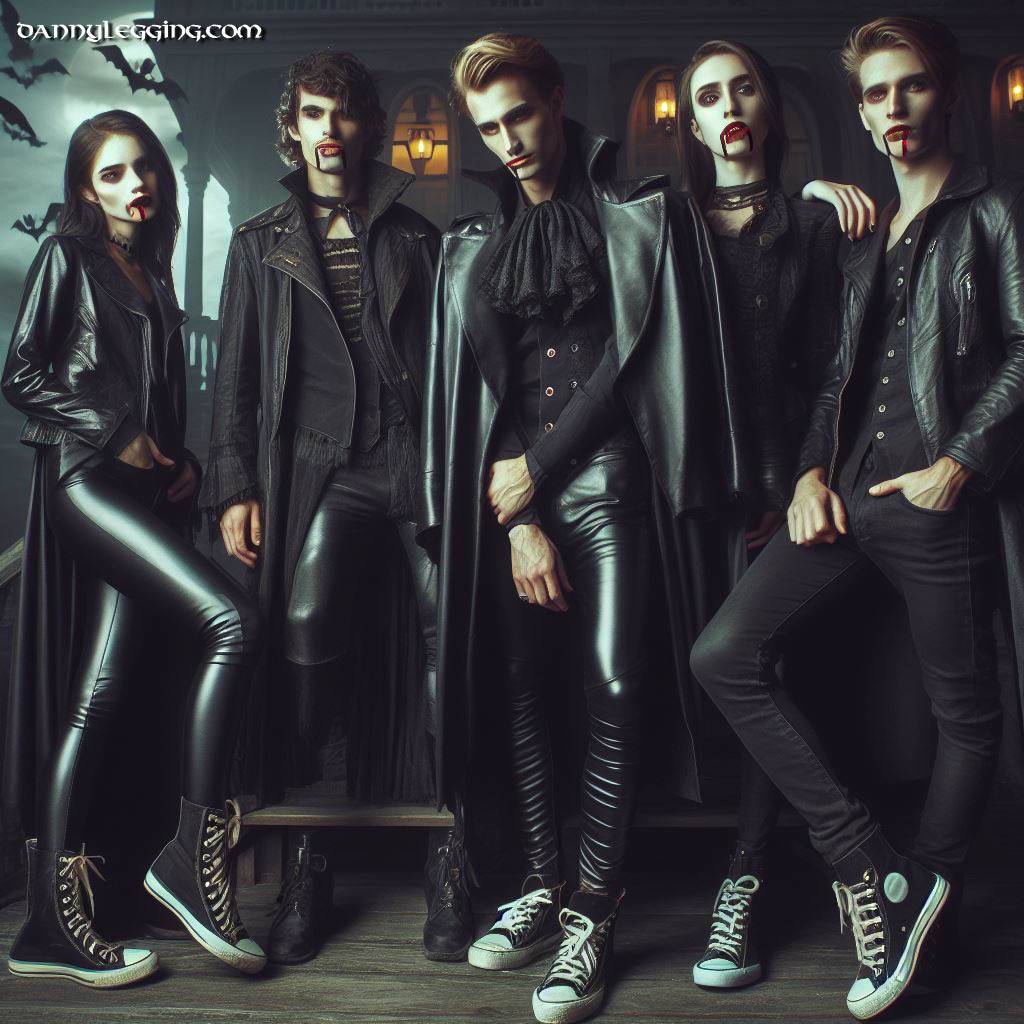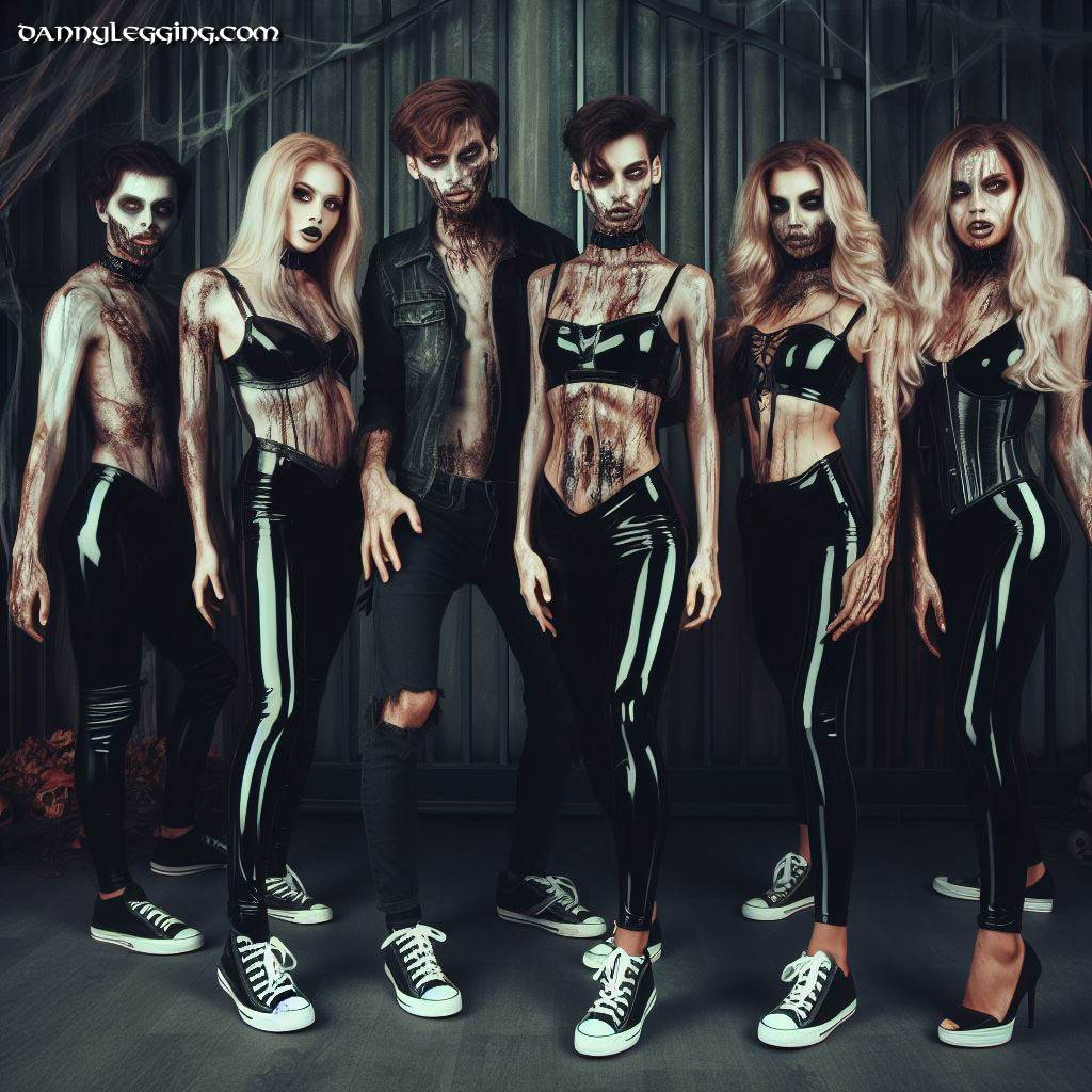 AI generated art for 2023 Halloween. Mix of zombies, zombie-like group, vampires in leather leggings, latex and patent pants. With Halloween themes and backgrounds.