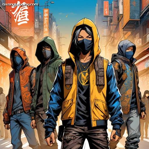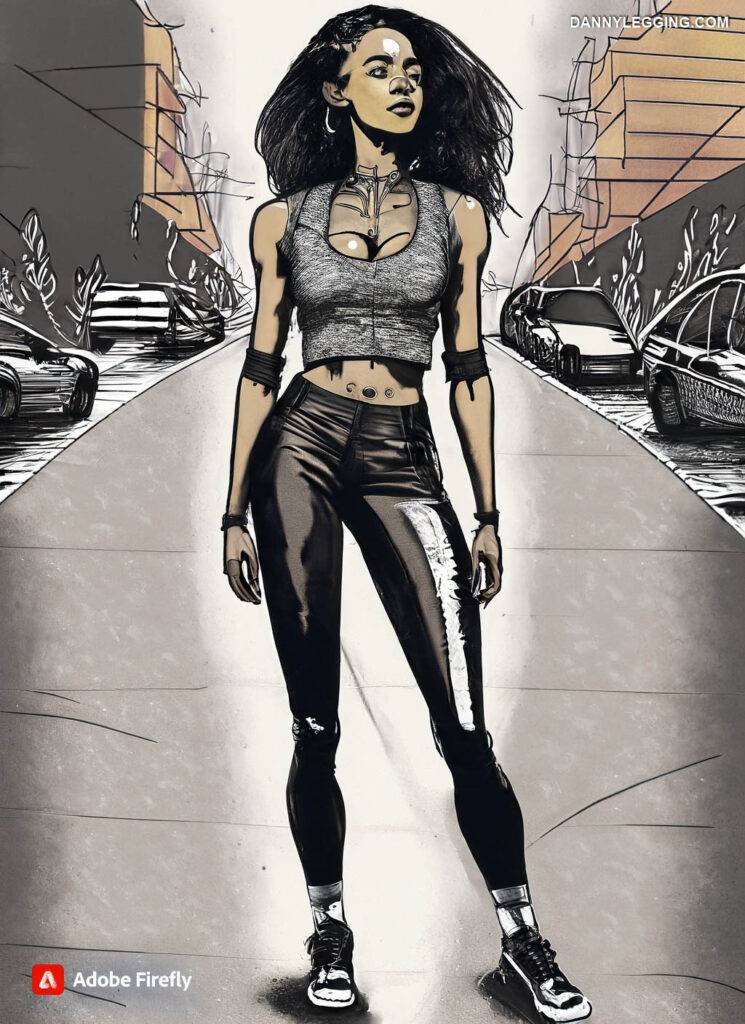 AI generated art showing women with leather leggings, street style outfits and leisurewear. Also image of a gang, group of individuals in a city setting.