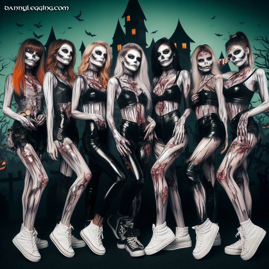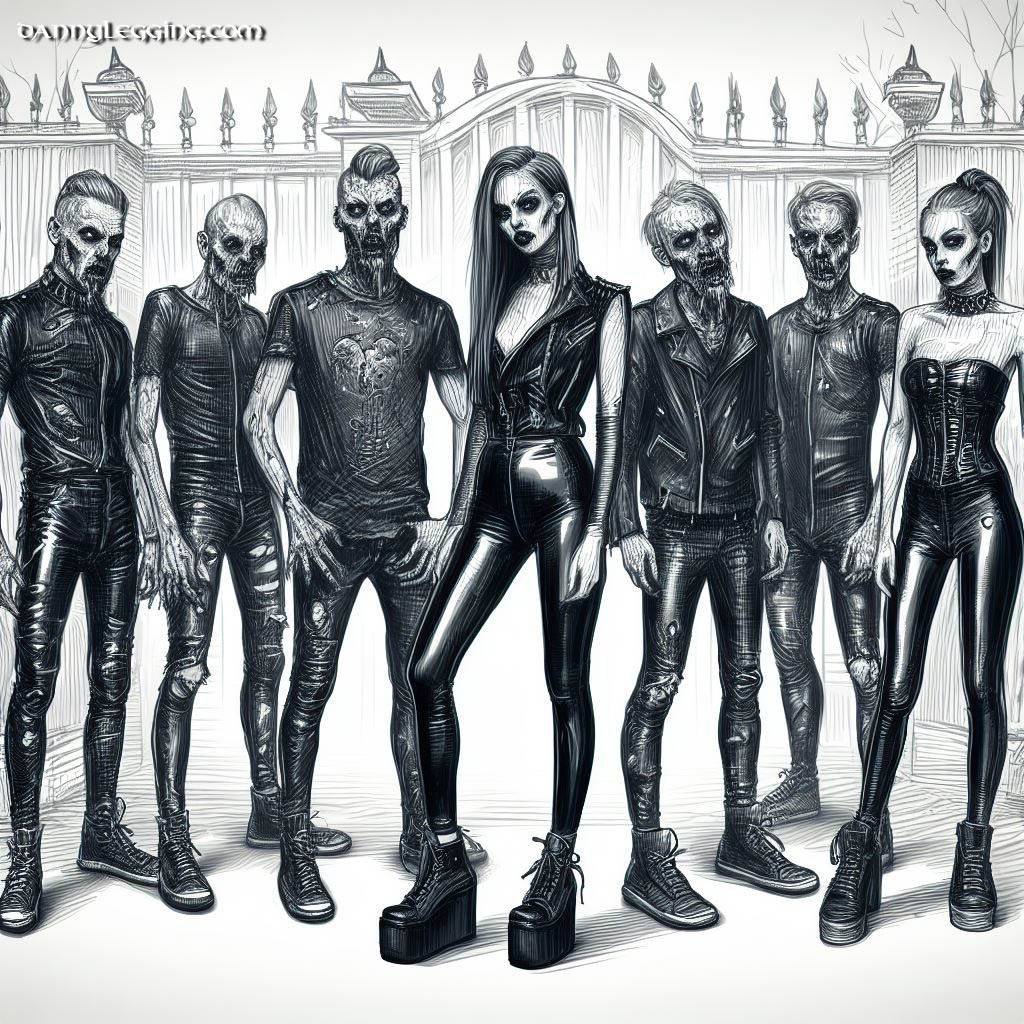 AI generated art for 2023 Halloween. Mix of zombies, zombie-like group, vampires in leather leggings, latex and patent pants. With Halloween themes and backgrounds.