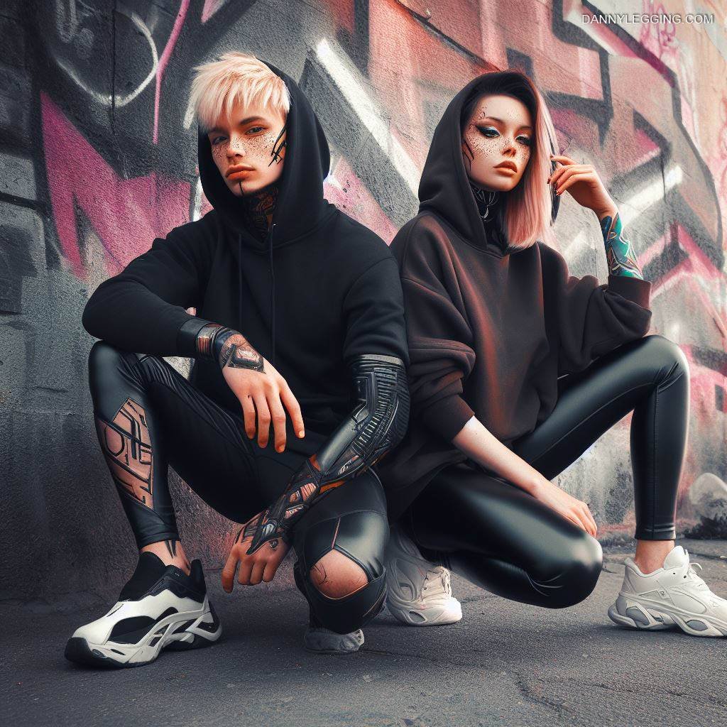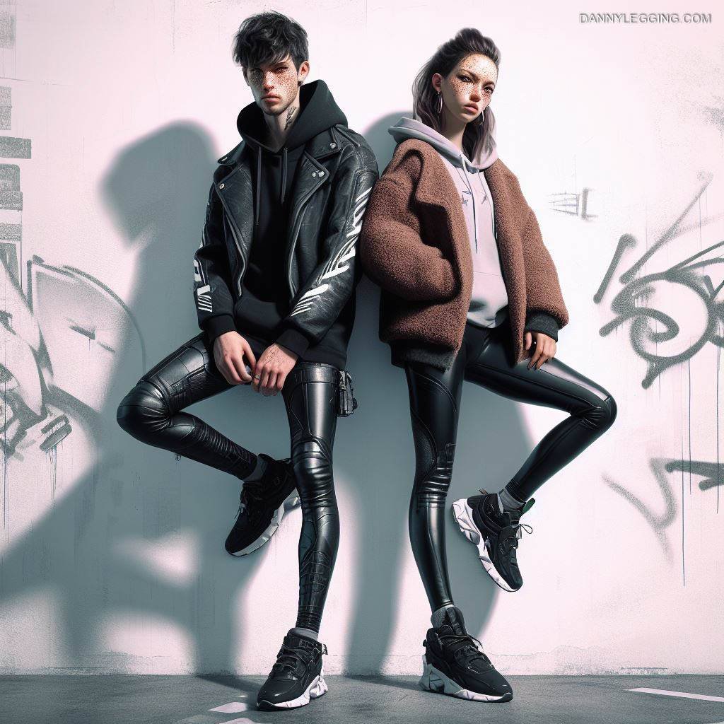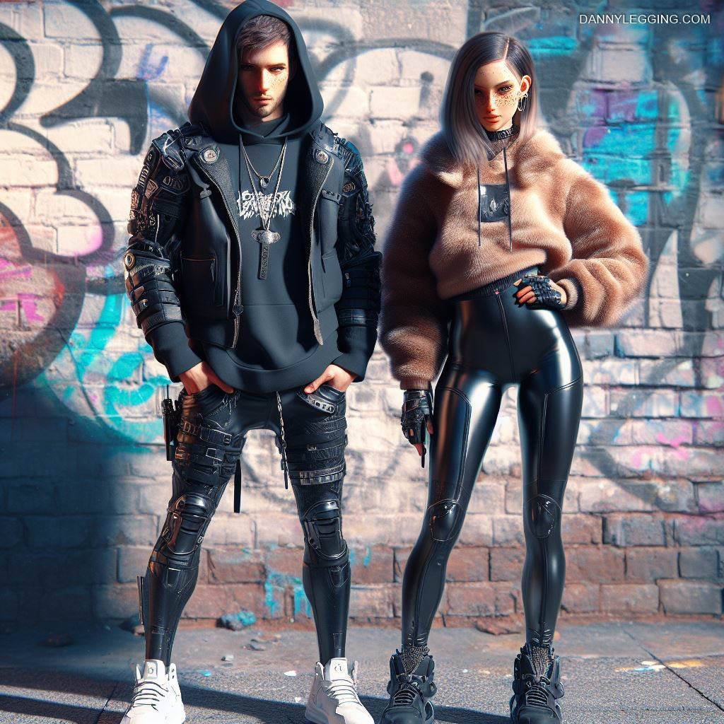 AI generated art with mix of realism and video game style art. Showing man and woman, freckled faces possibly couple, both wearing leather and latex leggings, interesting outfits with futuristic, cyberpunk, street vibe.