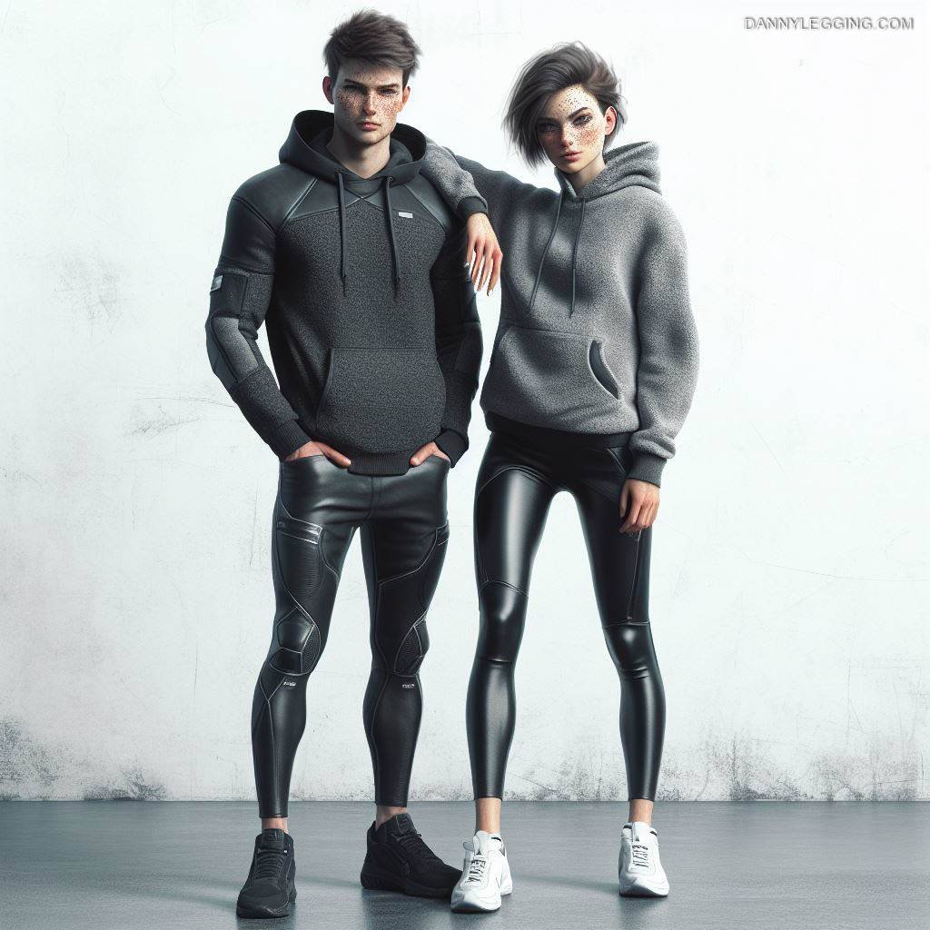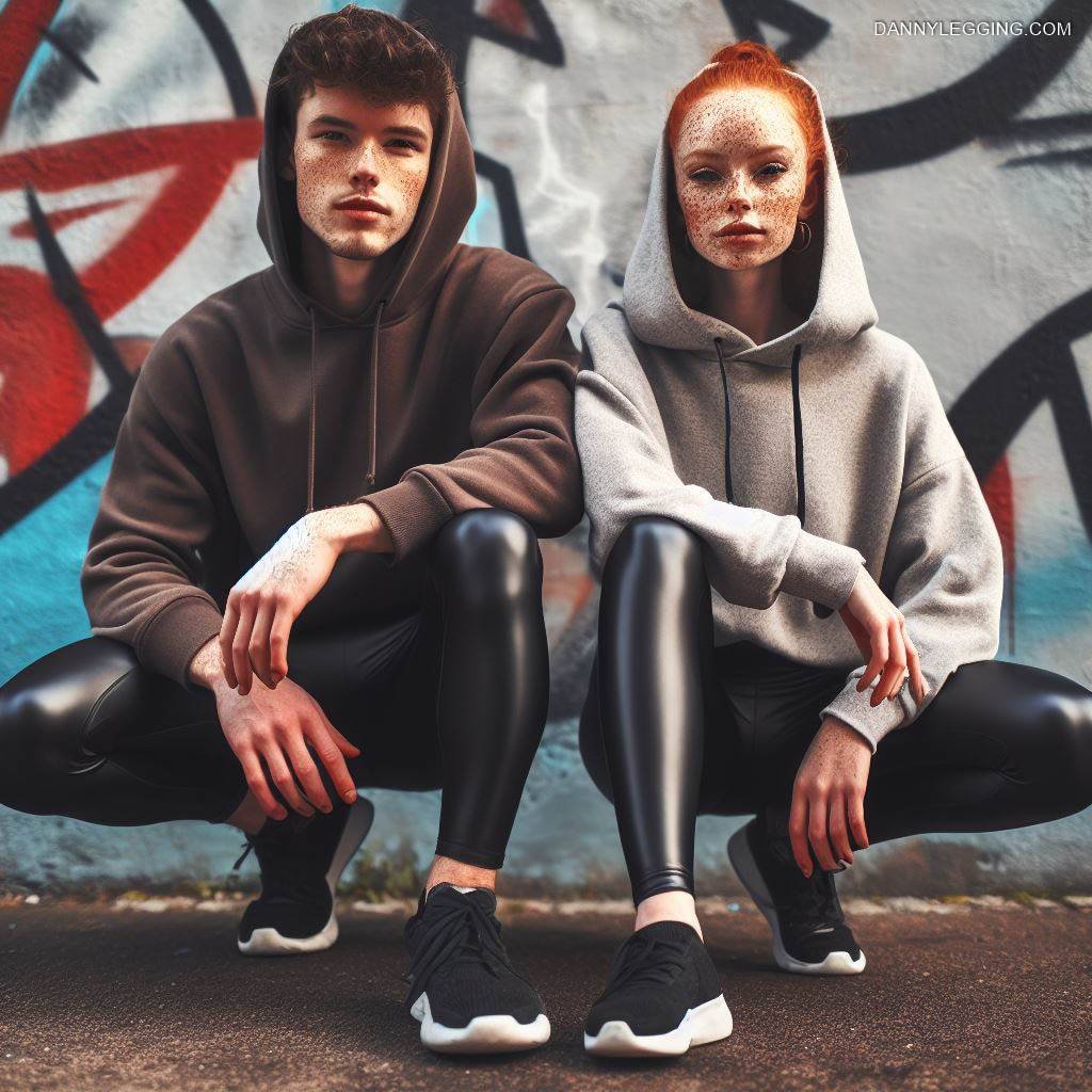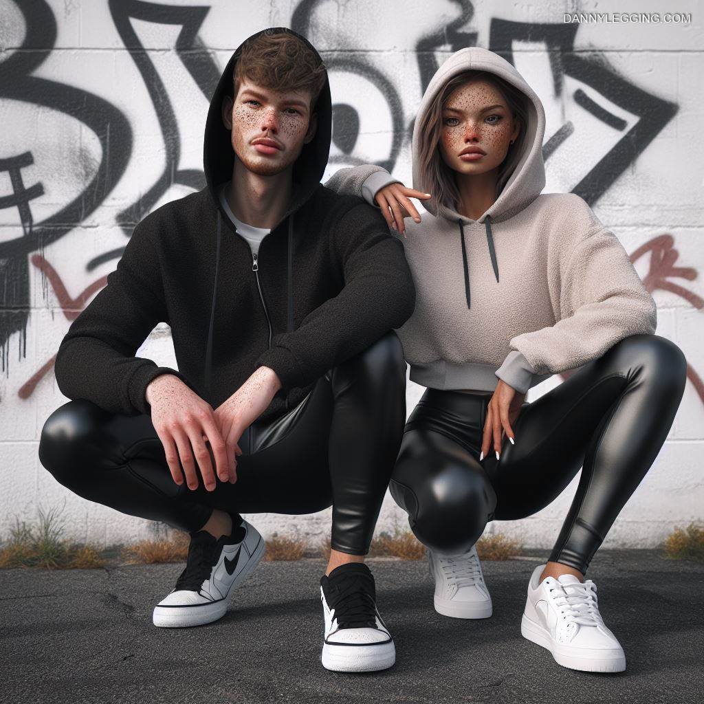 AI generated art with mix of realism and video game style art. Showing man and woman, freckled faces possibly couple, both wearing leather and latex leggings, interesting outfits with futuristic, cyberpunk, street vibe.