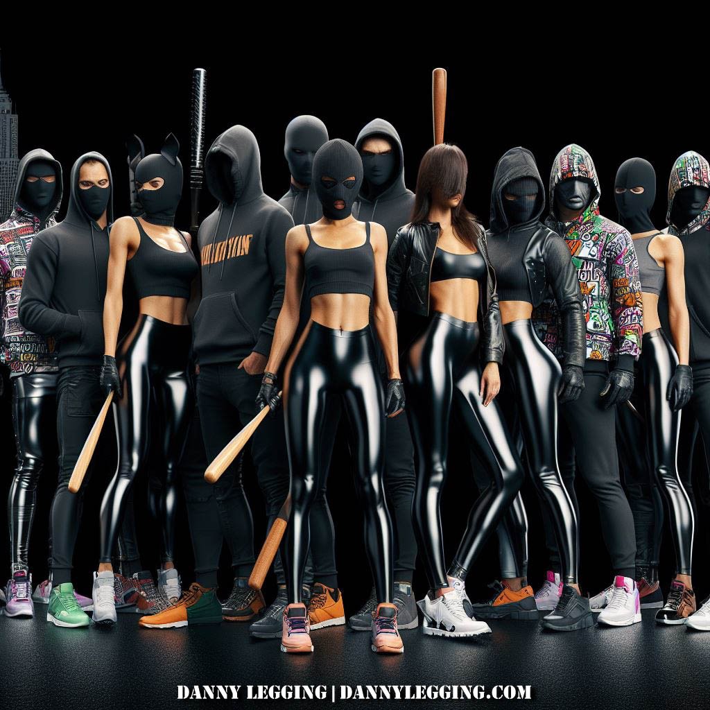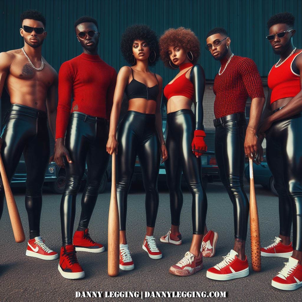 AI generated art depicting more groups of people in red and black, and various other outfits, with melee and other weapons, wearing hoodies, masks, leather leggings and pants. Modernised looking street gang you’d see in a video game.