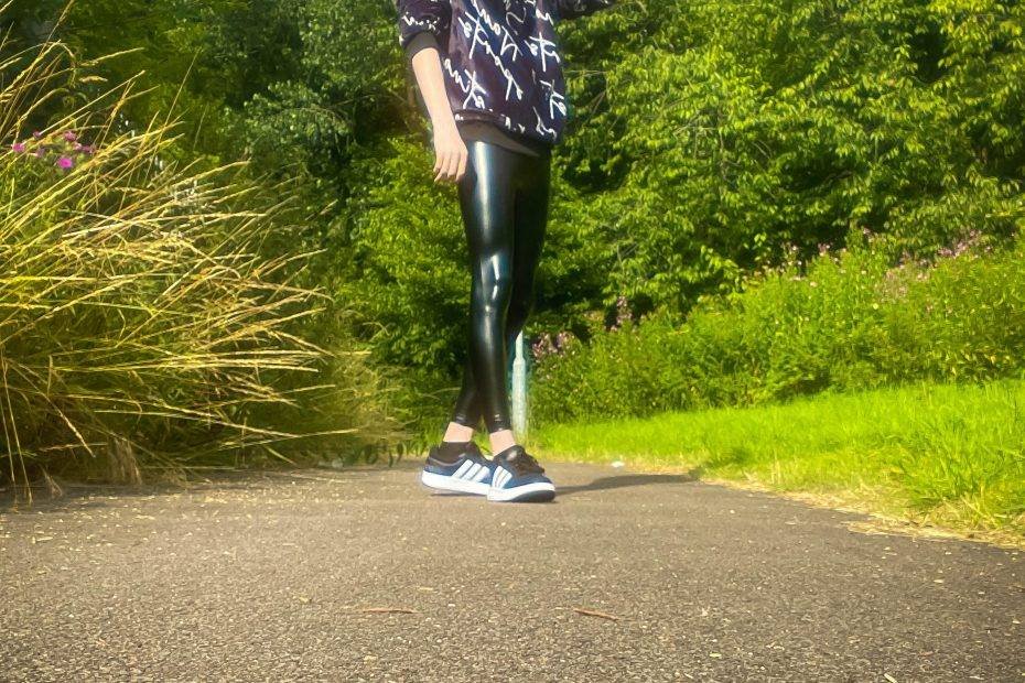 Modern Casual Look: Leather Leggings and Black Sneakers
